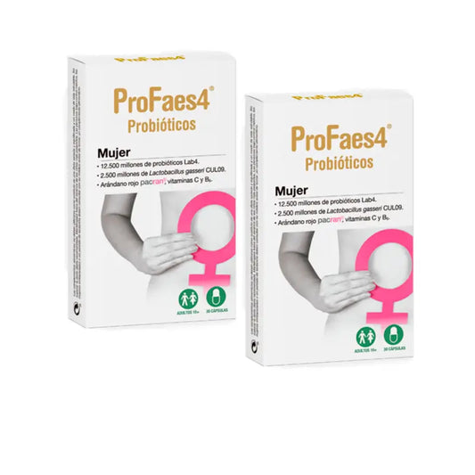 ProFaes4® Mujer es un complemento alimenticio formulado específicamente para mantener el equilibrio de la microbiota vaginal y apoyar la salud femenina. Cada cápsula contiene 12.500 millones de bacterias probióticas del consorcio Lab4, 2.500 millones de Lactobacillus gasseri CUL09, extracto patentado de arándano rojo Pacran®, y vitaminas C y B6. Estos ingredientes contribuyen al funcionamiento normal del sistema inmunitario y ayudan a prevenir infecciones del tracto urinario.