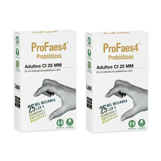 ProFaes4® Adultos CI 25 MM es un complemento alimenticio diseñado para mantener el equilibrio de la microbiota intestinal en adultos. Combina probióticos del consorcio Lab4 y prebióticos (fructooligosacáridos) para promover una flora intestinal saludable. Cada cápsula aporta 12.500 millones de bacterias activas, incluyendo cepas de Lactobacillus acidophilus y Bifidobacterium bifidum. Se recomienda tomar dos cápsulas al día, preferiblemente después de las comidas, evitando su consumo con líquidos o alimentos calientes.