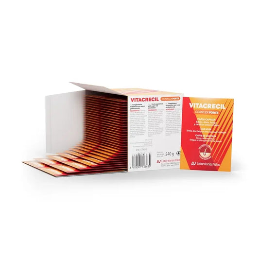 Los productos Vitacrecil están compuestos de Biotina, vitamina cuyo aporte suficiente contribuye al normal mantenimiento del cabello sobre todo cuando se combina con el Zinc; Cistina, un aminoácido azufrado constitutivo de la queratina que junto con la vitamina B6 mejora su absorción y potencia su acción y el Ácido Pantoténico o Vitamina B5, que combinada con la Vitamina B6, el Hierro y el Zinc completan una fórmula eficaz con la que parar la caída del cuero cabelludo y conseguir un pelo fuerte y sano, recuperando su vitalidad, brillo y volumen a medida que realizamos el tratamiento de una forma continuada y diaria durante un mínimo de tres meses tomando dos capsulas al día junto con las comidas. Para prevenir la caída estacional del cabello se recomienda tomar Vitacrecil Complex Forte especialmente en primavera y otoño, épocas en las que se manifiesta una mayor tendencia a la caída del pelo, así como complementar este tratamiento oral con un tratamiento tópico como un champú anticaída.