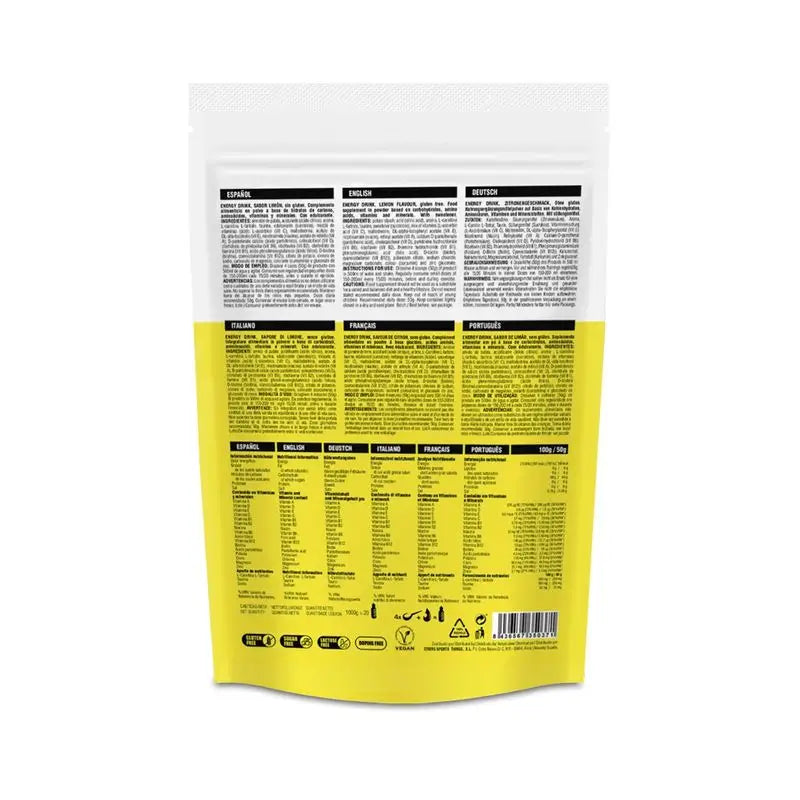 DESCRIPCIÓN DEL PRODUCTO Isotonic Drink es una bebida isotónica y energética sin gluten, sin lactosa y sin azúcar. Contiene un mix de Vitaminas y Minerales para cubrir las necesidades de las mismas durante el esfuerzo. Isotonic Drink es la bebida perfecta para tomar durante los entrenamientos de menos de 90´ y como hidratación y recarga de depósitos de sales minerales previas a competiciones y recuperación de los niveles de sales minerales después del ejercicio físico, además de aportar unos 17 g de hidratos de carbono por toma que provienen de la amilopectina del almidón de patata, que presenta grandes ventajas respecto a otros ingredientes utilizados habitualmente: Vaciado ga´strico hasta 80% más ra´pido. Recarga el gluco´geno hasta el 70% más rápido ya que es de gran disponibilidad. Contiene 100 mg de Beta Alanina, que retrasa la aparición de fatiga. Siguiendo nuestra filosofía sobre la sostenibilidad y el cuidado del medioambiente, ahora utilizamos nuevos envases que nos ayudan a lograr este objetivo: Reducción de plástico y de recursos empleados del 82%* Reducción del volumen en envase lleno del 33%*, con lo que mejora el almacenamiento ahorrando espacio. Reducción del volumen del envase vacío del 97%*, con lo que reduce la huella de carbono en la producción. valores aproximados MODO DE EMPLEO Disolver 1,5 cazos (20g) de producto con 500ml de agua y agitar. Consumir con regularidad en pequeñas dosis de 150ml cada 15/20 minutos, durante y después del ejercicio. CANTIDAD NETA 20g (1 toma) 500g (25 tomas) y 1Kg (50 tomas). TIPO DE ENVASE Bolsa doypack: Bolsa doypack: Cierre zip y abre fácil. 25 BOPE + 90 PE-EVOH Blanco. CONDICIONES DEL TRANSPORTE Temperatura ambiente y buen trato del producto. CONSERVACIÓN DEL PRODUCTO Mantener bien cerrado en lugar fresco y seco. VIDA ÚTIL 2 años desde la fecha de fabricación ComposiciónINGREDIENTES: Almidón de patata, acidulante (ácido cítrico), aroma, L-carnitina L-tartrato, taurina, edulcorante (sucralosa), mezcla de vitaminas (ácido L-ascórbico (Vit C), maltodextrina, acetato de DL-alfa-tocoferilo (Vit E), nicotinamida (niacina), acetato de retinilo (Vit A), D-pantotenato cálcico (ácido pantoténico), colecalciferol (Vit D), clorhidrato de piridoxina (Vit B6), riboflavina (Vit B2), clorhidrato de tiamina (Vit B1), ácido pteroilmonoglutámico (ácido fólico), D-biotina (biotina), cianocobalamina (Vit B12)), citrato de potasio, cloruro de sodio, carbonato de magnesio, colorante (curcumina) y gluconato de zinc.IngredientesINGREDIENTES: Almidón de patata, acidulante (ácido cítrico), aroma, L-carnitina L-tartrato, taurina, edulcorante (sucralosa), mezcla de vitaminas (ácido L-ascórbico (Vit C), maltodextrina, acetato de DL-alfa-tocoferilo (Vit E), nicotinamida (niacina), acetato de retinilo (Vit A), D-pantotenato cálcico (ácido pantoténico), colecalciferol (Vit D), clorhidrato de piridoxina (Vit B6), riboflavina (Vit B2), clorhidrato de tiamina (Vit B1), ácido pteroilmonoglutámico (ácido fólico), D-biotina (biotina), cianocobalamina (Vit B12)), citrato de potasio, cloruro de sodio, carbonato de magnesio, colorante (curcumina) y gluconato de zinc.Valor nutricional TABLA NUTRICIONAL dfhdfh 100g50gValor energéticokJ / kcal1534 / 361767 / 180Grasasg00 de las cuales saturadasg00Hidratos de carbonog8844 de los cuales azúcaresg00Proteína g00Salg0,160,08Ca´lculo efectuado a partir de los valores teo´ricos conocidos o efectivos de los ingredientes utilizados