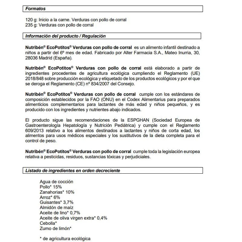 El potito eco inicio carne verduras pollo con 120 gr de Nutriben contribuye a la alimentación infantil saludable. Ha sido desarrollado para ayuda a empezar introducir en la dieta de los más pequeños la ingesta de verduras con pollo de corral.