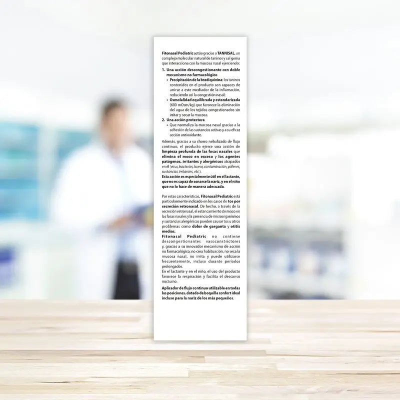 Fitonasal Pediatric está indicado en todos los casos de congestión e irritación de las fosas nasales debidas a síndromes gripales, resfriado, rinitis alérgicas y sinusitis, tanto agudas como crónicas. Puede utilizarse también como tratamiento coadyuvante en caso de tos y dolor de garganta causados por secreción retronasal y otitis medias consiguientes a congestión nasal. Ideal para un uso frecuente. El producto está indicado a partir de 6 meses de edad. El producto ejerce una acción de limpieza profunda de las fosas nasales que elimina el moco en exceso y los agentes patógenos, irritantes y alergénicos atrapados en él (virus, bacterias, humo, contaminación, pólenes, sustancias irritantes, etc.) y una acción descongestionante con doble mecanismo no farmacológico. Modo de empleo: De 6 meses a un año de edad: 1. Colocar al niño de costado, introducir el aplicador en el orificio nasal superior y suministrar el producto. 2. Repetir la operación en el otro orificio nasal colocando al niño sobre el otro lado. A partir de un año de edad: 1. Introducir el aplicador en un orificio nasal y ejercer una ligera presión durante algunos segundos. 2. Limpiar la nariz del niño o, si es posible, ayudarle a sonarse la nariz. Repetir la nebulización en el otro orificio nasal. Después de cada uso, limpiar el aplicador con un paño húmedo y limpio y secar cuidadosamente.