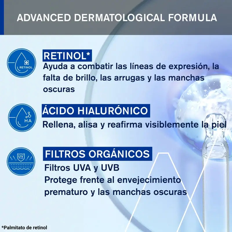 "Arrugas, falta de firmeza, fotoenvejecimiento. La piel se ve más lisa y firme, las líneas de expresión se atenúan. El contorno del rostro se redefine. Enriquecida con filtros solares UVA/UVB, la piel se protege frente al envejecimiento prematuro y las manchas pigmentarias."