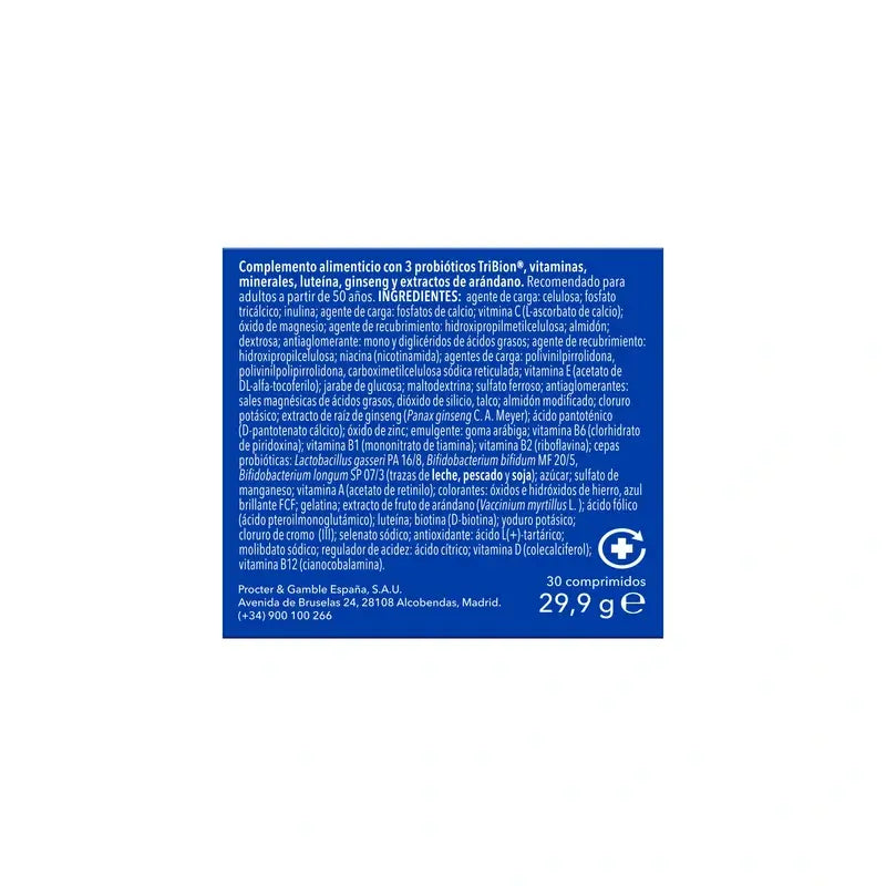 Además, los comprimidos Bion3 Energy 50+ contienen Vitaminas B2, B3 y B7 para ayudar al intestino, así como 10 millones de probióticos (L. gasseri, B. bifidum, B. longum) que llegan vivos al intestino.