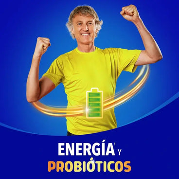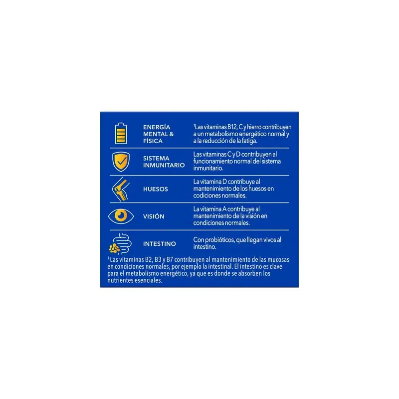 Con 3 probióticos, 12 vitaminas y 7 minerales. Las vitaminas B2, B3 y B7 ayudan al intestino², las Vitaminas B12 y B6 ayudan al metabolismo energético¹, la Vitamina C y el Hierro ayudan a la reducción de la fatiga¹