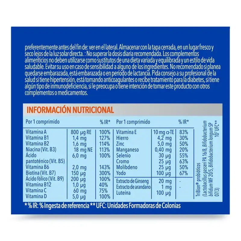 Cada comprimido contiene 12 vitaminas esenciales y 7 minerales, incluyendo Vitaminas B12, B1, B2, B3, B5, B6 y B7 para ayudar al metabolismo energético, Vitamina C y Hierro para ayudar a reducir el cansancio y la fatiga, Vitamina A y Zinc para ayudar a la visión y Vitamina D para ayudar a la salud de los huesos.