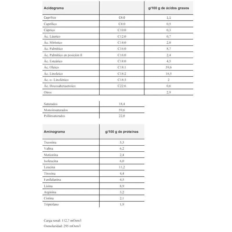 Suero desmineralizado (leche), Maltodextrina, Aceites vegetales (Girasol alto oleico, Nabina, Girasol), Leche desnatada, Leche desnatada A2 (5%), Grasa láctea (leche), Fructooligosacáridos, Inulina, Minerales (Potasio, Cloruro, Calcio, Fósforo, Sodio, Magnesio, Hierro, Zinc, Cobre, Manganeso, Yodo, Selenio), Aceite de pescado (DHA), Aroma, Mezcla 2’-fucosil-lactosa/difucosil-lactosa (2’-FL/DFL) (leche), Vitaminas (C, E, Niacina, Ácido pantoténico, Riboflavina, Tiamina, A, B6, Ácido fólico, K, Biotina, D, B12), Colina, Lacto-N-Tetraosa (LNT) (leche), Inositol, Emulgente (Lecitina de girasol), Taurina, Nucleótidos (Citidina, Uridina, Adenosina, Inosina, Guanosina), L-Fenilalanina, Antioxidantes (Mezcla de tocoferoles, Palmitato de ascorbilo), L-Carnitina, Sal sódica de 6’-sialilactosa (6’-SL) (leche), sal sódica de 3’-sialilactosa (3’-SL) (leche), Bifidobacterias y Lactobacilos (L. rhamnosus HN001, B. bifidum, B. breve, B. infantis IM1, L. helveticus, L. rhamnosus R11) 1x109 UFC/100 g, Corrector de acidez (Ácido cítrico)