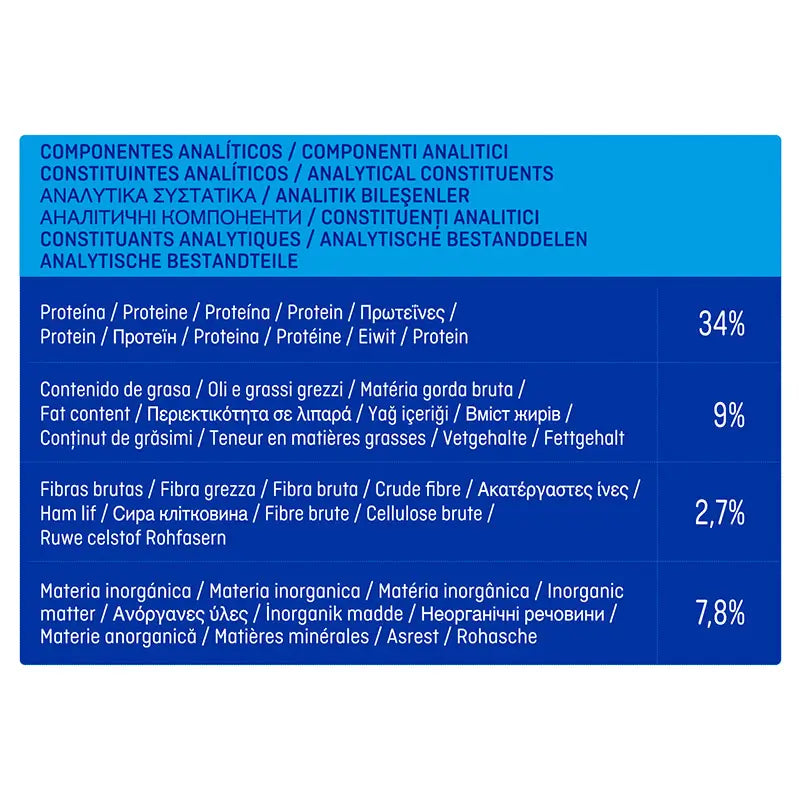 Cereales (10 % trigo integral, 4 % cebada integral), carne y subproductos animales (4 % proteína de pollo deshidratada), extractos de proteínas vegetales, subproductos vegetales (2,5 % pulpa de remolacha), aceites y grasas, verduras (2 % guisantes deshidratados, equivalente a 7,7 % guisantes frescos, 0,05 % zanahorias deshidratadas, equivalente a 0,4 % zanahorias frescas), minerales, azúcar.