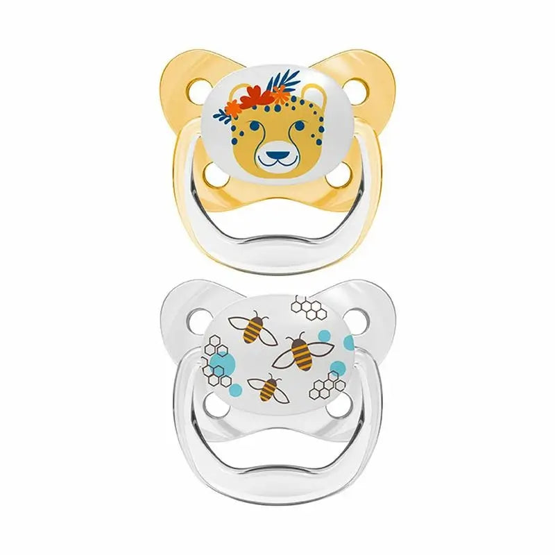 Escudo contorneado en forma de mariposa con curvas, ofreciendo una mayor comodidad, dejando más espacio para la nariz y las mejillas del bebé, para evitar así las rozaduras. Tetina fabricada en silicona médica. Esterilización y lavado en el lavavajillas (rejilla superior). Pack de 2 chupetes, cada uno con su protector. Sin BPA.