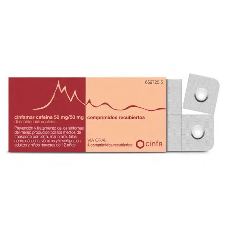 Cada comprimido de Cinfamar cafeína contiene 50 miligramos de dimenhidrinato y 50 miligramos de cafeína como principios activos. El resto de excipientes presentes en el núcleo son: almidón de maíz, sílice coloidal anhidra, celulosa microcristalina, hidrógeno fosfato de calcio dihidrato, estearato de magnesio, carboximetilalmidón sódico (de patata) (tipo A), povidona, talco. El resto de agentes de recubrimiento son: macrogol 6000, hipromelosa 606, hipromelosa 615.
