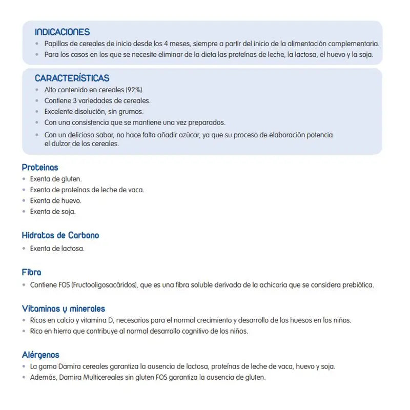 Harina de cereales (92 %) (arroz, maíz, tapioca), azúcar, fibra soluble (fructooligosacáridos 3 %), sales minerales (carbonato cálcico, hierro elemental), aroma (vainillina), maltodextrina, vitaminas (L-ascorbato sódico, acetato de DL- -tocoferol, nicotinamida, acetato de retinilo, D-pantotenato cálcico, colecalciferol, clorhidrato de piridoxina, clorhidrato de tiamina, ribo avina, cianocobalamina, ácido fólico, D-biotina).
