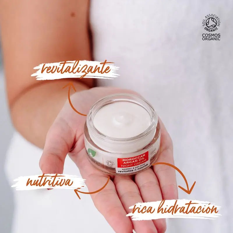 https://www.farmaciasdirect.es/products/dr-organic-crema-de-noche-aceite-argan-marroqui-50mlDR5060176674806Dr.Organic Aceite De Argán Crema De Noche Piel Normal A Seca, 50 mlBeneficios clave: Hidratación intensa, Nutrición, Revitalización.Tipo de piel: Piel normal a seca.Ideal para: Piel normal a seca, piel sanaEl aceite de argán marroquí es una fuente increíblemente rica en vitaminas, antioxidantes y ácidos grasos esenciales.Esta rica crema revitalizante de noche también incluye tres extractos orgánicos africanos: Kigelia, Roselle y Baobab por sus propiedades antioxidantes únicas que pueden ayudar a suavizar y mantener una piel sana y de aspecto radiante.Este tratamiento nocturno ha sido formulado para actuar mientras duermes, proporcionando una acción que puede ayudar a reducir la línea visible de las arrugas.ComposiciónAgua, zumo de hoja de Aloe barbadensis en polvo†, triglicérido caprílico/cáprico, alcohol cetearílico, caprilato de coco, estearato de glicerilo, manteca de Butyrospermum parkii (karité)†, glicerina, glucósido de cetearilo,*ACEITE DE SEMILLA DE ARGANIA SPINOSA (ACTIVO CLAVE: Moroccan Argan Oil)†, Argania spinosa (Argan) kernel extract†, Hibiscus sabdariffa flower extract†, Kigelia africana fruit extract†, Adansonia digitata (Baobab) fruit extract†, Triticum vulgare (Wheat) germ oil, Ácido salicílico, Tocoferol, Chrondrus crispus en polvo, Estearoil glutamato sódico, Goma xantana, Parfum, Ácido cítrico, Fitato sódico, Deshidroacetato sódico, Benzoato sódico, Sorbato potásico, Ácido sórbico, Alcohol bencílico, Ácido deshidroacético, Limoneno, Citronelol, Geraniol, Linalol. † certificado orgánico, 22% orgánico, 98% de origen natural.Modo de empleoAplicar suavemente con movimientos circulares despúes de la limpieza.IngredientesPiel normal a secaConsejo farmacéuticoNo ingerir. Evitar contacto con los ojos. No aplicar sobre irritada. Si se produce sensibilidad, suspenda su uso. Evite este producto si es alérgico o sensible a cualquiera de los ingredientes. Mantener fuera del alcance de los niños. Guardar en un lugar fresco y seco.https://www.farmaciasdirect.es/cdn/shop/files/dr-organic-crema-de-noche-aceite-argan-marroqui-50ml.webp?crop=center&height=300&v=1725061486&width=300https://www.farmaciasdirect.es/cdn/shop/files/dr-organic-crema-de-noche-aceite-argan-marroqui-50ml.webp?crop=center&height=100&v=1725061486&width=10012.015.993.9924.95