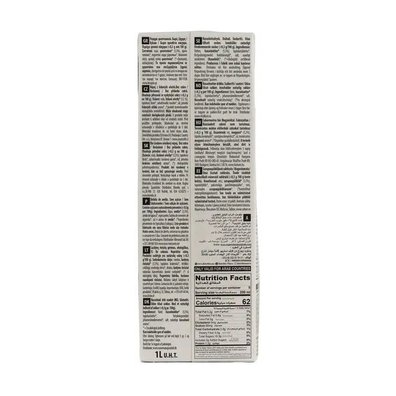 Agua, avellanas* (5.5%), almidón de tapioca*, espesante: goma de semillas de algarrobo*, sal marina y aroma natural de avellana*. *Ingredientes procedentes de la Agricultura Ecológica. Este producto se fabrica en una planta donde se manipulan frutos secos