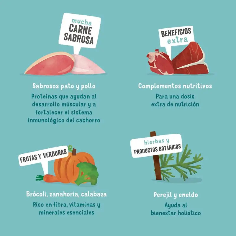 CaracterísticasRepleta de sabroso pato y pollo, esta receta sin cereales está especialmente diseñada para satisfacer las necesidades nutricionales de un cachorro en crecimiento. Está lleno de proteínas de alta calidad, que ayuda al desarrollo muscular y fortalece el sistema inmunitario. Como beneficio adicional, combinamos la carne con complemetos nutritivos (como el corazón y el hígado) para una ayuda adicional de nutrición. Combinamos nuestras recetas con una mezcla súper saludable de frutas y verduras, además de un impulso extra de hierbas nutritivas y productos botánicos. Luego lo cocinamos lentamente para mantener todo el sabor y beneficios.Composición e IngredientesComposición: pato 30%, pollo 26%, minerales, zanahorias 2%, brécol 1%, manzanas 1%, calabaza 1%, guisantes 1%, aceite de salmón 0,5%, perejil 0,1%, eneldo 0,1%. Aditivos: Aditivos nutricionales/kg: vitamina D3 140 UI. Cinc (sulfato de cinc monohidratado) 12 mg, manganeso (óxido de manganeso (II)) 1 mg, cobre (sulfato cúprico, pentahidratado) 0,5 mg, yodo (yodato de calcio anhidro) 0,3 mg.. Aditivos tecnológicos: Ninguno. Componentes analíticos: proteína bruta 9,5%, grasa bruta 6%, fibra bruta 0,3%, ceniza bruta 2,2%, humedad 81%.