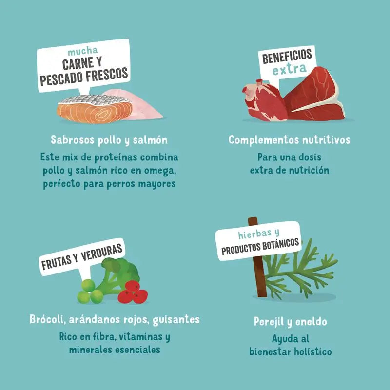 Composición: pollo 42%, salmón 14%, minerales, guisantes 2%, boniatos 1%, calabaza 1%, brécol 1%, arándanos rojos 1%, perejil 0,1%, eneldo 0,1%. Aditivos: Aditivos nutricionales/kg: cinc (sulfato de cinc monohidratado) 15,2 mg, manganeso (sulfato manganoso, monohidratado) 3,2 mg, yodo (yodato de calcio anhidro) 0,5 mg.. Aditivos tecnológicos: Ninguno. Componentes analíticos: proteína bruta 9%, grasa bruta 5%, fibra bruta 0,3%, ceniza bruta 2,2%, humedad 82%.