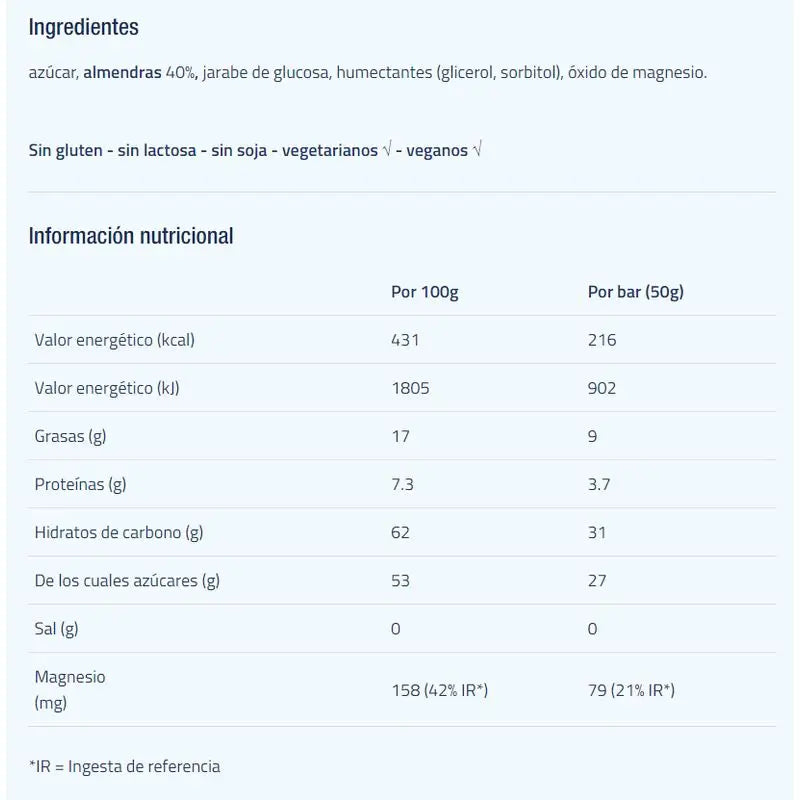 azúcar, almendras 40%, jarabe de glucosa, humectantes (glicerol, sorbitol), óxido de magnesio.