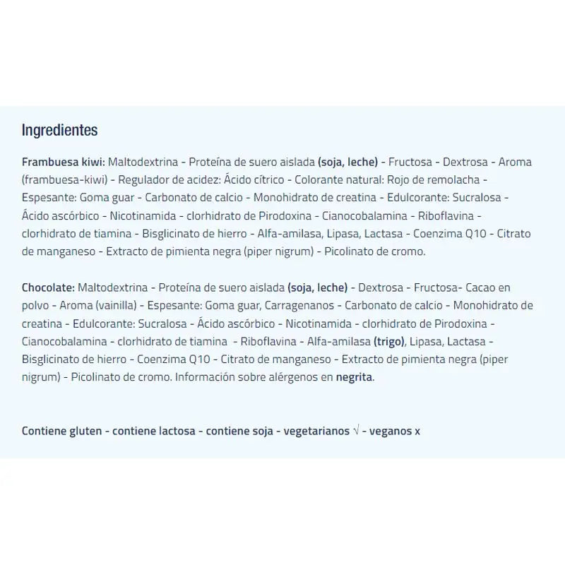 Maltodextrina - Proteína de suero aislada (soja, leche) - Fructosa - Dextrosa - Aroma (frambuesa-kiwi) - Regulador de acidez: Ácido cítrico - Colorante natural: Rojo de remolacha - Espesante: Goma guar - Carbonato de calcio - Monohidrato de creatina - Edulcorante: Sucralosa - Ácido ascórbico - Nicotinamida - clorhidrato de Pirodoxina - Cianocobalamina - Riboflavina - clorhidrato de tiamina - Bisglicinato de hierro - Alfa-amilasa, Lipasa, Lactasa - Coenzima Q10 - Citrato de manganeso - Extracto de pimienta negra (piper nigrum) - Picolinato de cromo.