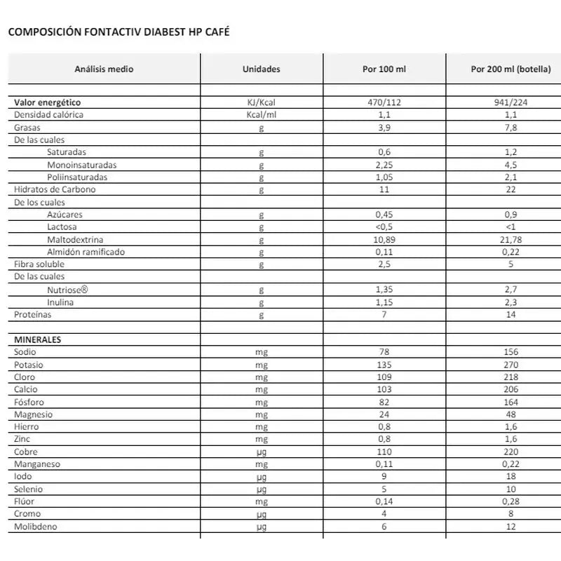 La FontActiv Diabest HP Café de Ordesa, ofrece una alimentación completa y adecuada en pacientes con diabetes o intolerantes a la glucosa, que presentan desnutrición, contiene activos que facilitan su digestión, se puede administrar vía oral o a través de sonda, viene en cómoda presentación ya lista envasada en botes de larga duración y con delicioso sabor a café, que facilitan su aceptación. Puede ingerirse frío o tibio, a juicio del consumidor.