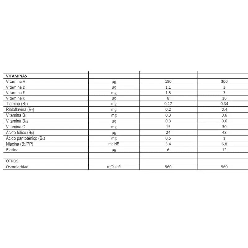 Agua, proteínas de leche, maltrodextrina, azúcar, aceite de colza, emulgente (mono y diglicéridos de ácidos grasos), estabilizantes (goma guar, carragenanos), citrato tripotásico, citrato trisódico, cloruro de magnesio, cloruro de sodio, fosfato de potasio, citrato de magnesio, cloruro de potasio, fosfato de sodio, pirofosfato férrico, sulfato de zinc, selenito de sodio, sulfato cúprico, sulfato de manganeso, fluoruro de sodio, cloruro de cromo, molibdato de sodio, yoduro de potasio, aromas, colorantes (betacaroteno), corrector de la acidez (hidróxido de potasio), ácido ascórbico, ácido pantoténico, vitamina B2, vitamina B6, vitamina B1, vitamina A, vitamina K1, ácido fólico, biotina, vitamina D, vitamina E, niacina, vitamina B12.