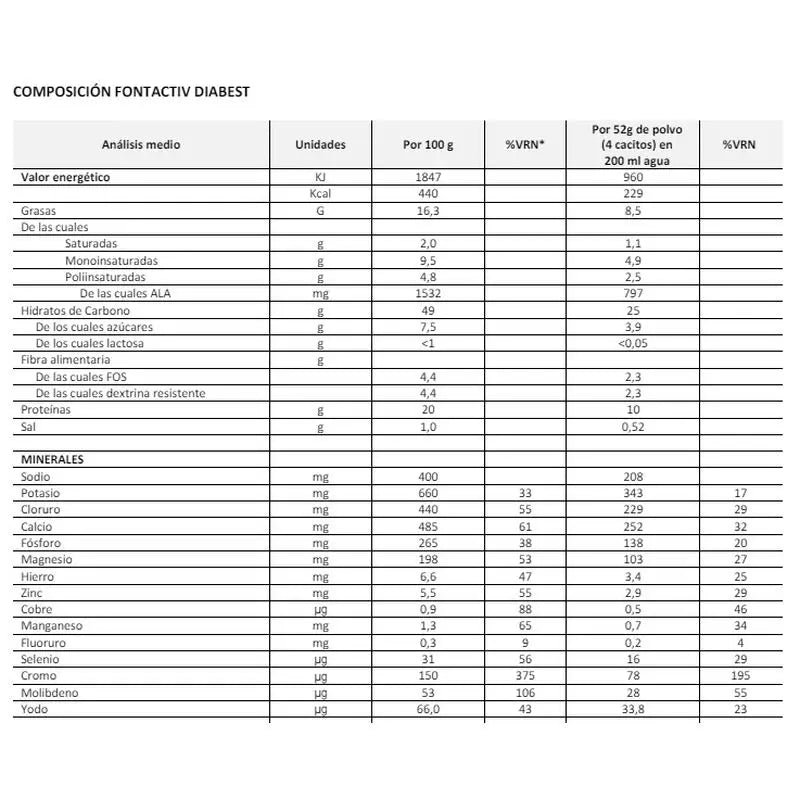 FontActiv Diabest Vainilla 400g está indicado para adultos bajo una dieta de control glucémico y que se encuentren en situaciones de debilidad, poco apetito, convalecencia, pérdida de peso involuntaria y, en general, en todas aquellas situaciones que requieran un aporte nutricional extra.