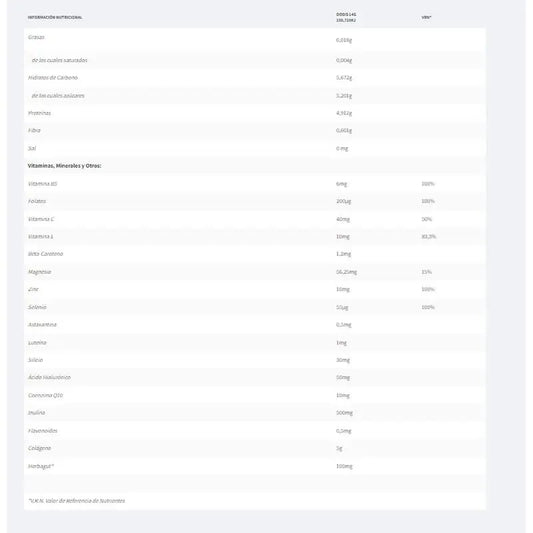 Zumo de granada, Acido Hialurónico, Hyabest ®, Vitamina C, Vitamina B3, Vitamina B2 y Biotina