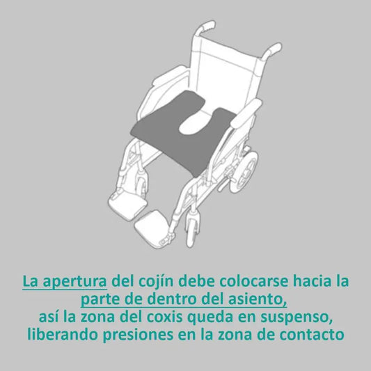 Es de gran importancia colocarlos correctamente para que sean totalmente efectivos, su finalidad es dejar la zona del coxis en suspenso para liberarlo de presión. Sus características son las siguientes: Medidas: 46 x 37 x 3 a 7 cm Material interior: Espuma de poliuretano. Material Exterior: Poliéster Peso neto: 350 g Recomendaciones de uso: Diseñado para prevenir la formación de escaras en personas con una movilidad limitada o que deban pasar largos periodos de tiempo sentados o encamados. Recomendado en pacientes con sedestación media. Proporciona estabilidad. Consigue un reparto homogéneo de las presiones. Ayuda a mantener la postura absorbiendo impactos. Se recomienda su lavado: Lavarse periódicamente siempre a mano a una temperatura máxima de 30º y con jabón neutro. No utilizar productos abrasivos, disolventes o alcoholes. No tender por sus extremos. Precauciones de uso: Debido a que se trata de un producto inflamable, no lo exponga directamente al sol ni a una fuente de calor.