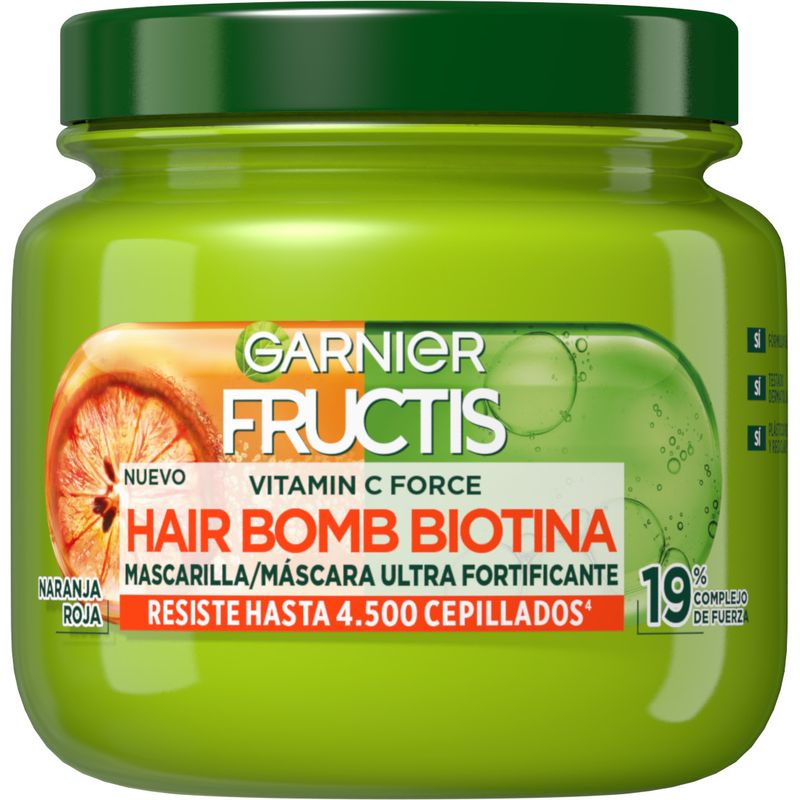La mascarilla capilar Fructis Vitamin C Force Hair Bomb Biotina para cabello frágil con tendencia a caerse. Aumenta la masa capilar y reduce la caída del cabello.