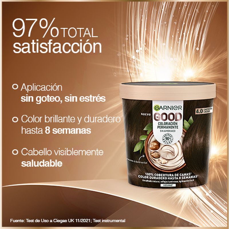 https://www.farmaciasdirect.es/products/garnier-good-coloracion-permanente-sin-amoniaco-90-origen-natural-tono-40-castano-cacaoGA3600542518826Garnier Good Coloración Permanente Sin Amoniaco, 90% Origen Natural Tono 4.0 Castaño Cacao.GARNIER GOOD Coloración Permanente Sin Amoniaco, 90% Origen Natural, Fórmula Vegana Tono 4.0 Castaño Cacao.Ingredientes1152439 - INGREDIENTS: AQUA / WATER • HYDROGEN PEROXIDE • CETEARYL ALCOHOL • SODIUM SALICYLATE • TRIDECETH-2 CARBOXAMIDE MEA • PHOSPHORIC ACID • CETEARETH-25 • TETRASODIUM ETIDRONATE • TETRASODIUM PYROPHOSPHATE • GLYCERIN (F.I.L. C202318/1).Características- 100% cobertura de canas.- Color natural y brillante, hasta 8 semanas.- Resultado natural, reflejos luminosos.- Pelo visiblemente sano.- x2 veces más brillo, x2 veces más nutrición para el cabello.https://www.farmaciasdirect.es/cdn/shop/files/GA3600542518826_Bn6qEnWbN6.jpg?crop=center&height=300&v=1725069250&width=300https://www.farmaciasdirect.es/cdn/shop/files/GA3600542518826_Bn6qEnWbN6.jpg?crop=center&height=100&v=1725069250&width=1008.5511.42.8525.0