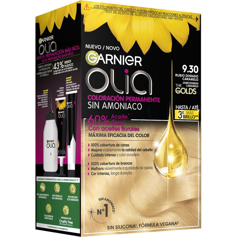 https://www.farmaciasdirect.es/products/garnier-olia-coloracion-permanente-sin-amoniaco-olor-agradable-con-aceites-florales-origen-natural-rubio-muy-claro-dorado-93GA3600541235274Garnier Olia Coloración Permanente Sin Amoniaco, Olor Agradable Con Aceites Florales Origen Natural - Rubio Muy Claro Dorado 9.3Garnier Olia es la coloración permanente Nº1* sin amoniaco para un olor agradable, potenciada por un 60%** de aceites florales naturales, para un olor agradable y respeto del cuero cabelludo. Coloración tras coloración, mejora visiblemente la calidad de tu pelo para un color intenso más brillante y más bonito, y un pelo suave y cuidado. 100% cobertura de canas. Confort óptimo del cuero cabelludo. * Fuente: Nielsen Ventas Volumen 2021 ** En la crema coloranteIngredientes1119728 B - INGREDIENTS: AQUA / WATER • CETEARYL ALCOHOL • BEHENTRIMONIUM CHLORIDE • CETYL ESTERS • CAMELLIA OLEIFERA SEED OIL • HELIANTHUS ANNUUS SEED OIL / SUNFLOWER SEED OIL • COCOS NUCIFERA OIL / COCONUT OIL • DILAURYL THIODIPROPIONATE • POTASSIUM HYDROXIDE • ISOPROPYL ALCOHOL • TOCOPHEROL • BENZOIC ACID • PARFUM / FRAGRANCE (F.I.L. Z282167/1).Modo de empleoCon los guantes puestos aplique el producto sobre el cabello seco sin lavar. Masajee el producto sobre su cabello y deje actuar 30 minutos. Añada una pequeña cantidad de agua sobre el cabello y masajee de nuevo para emulsionar el producto. Aclare abundantemente el cabello. Aplique una cantidad equivalente a una avellana de tratamiento post-coloración multi-aplicación y deje actuar 3 minutos. Aclare de nuevo el cabello con abundante agua.CaracterísticasMáxima eficacia del color. Color intenso y brillante, lleno de reflejos. 100% Cobertura de canas.https://www.farmaciasdirect.es/cdn/shop/files/GA3600541235274_FptQKSqyyq.jpg?crop=center&height=300&v=1725069011&width=300https://www.farmaciasdirect.es/cdn/shop/files/GA3600541235274_FptQKSqyyq.jpg?crop=center&height=100&v=1725069011&width=1008.659.81.1511.73