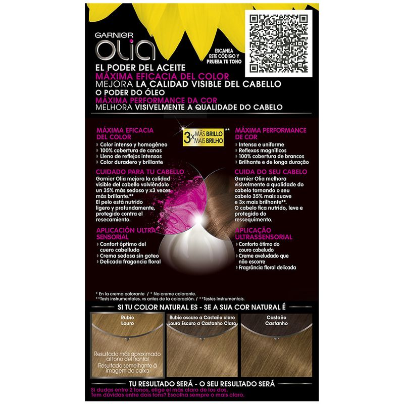 Garnier Olia es la coloración permanente Nº1* sin amoniaco para un olor agradable, potenciada por un 60%** de aceites florales naturales, para un olor agradable y respeto del cuero cabelludo. Coloración tras coloración, mejora visiblemente la calidad de tu pelo para un color intenso más brillante y más bonito, y un pelo suave y cuidado. 100% cobertura de canas. Confort óptimo del cuero cabelludo. * Fuente: Nielsen Ventas Volumen 2021 ** En la crema colorante