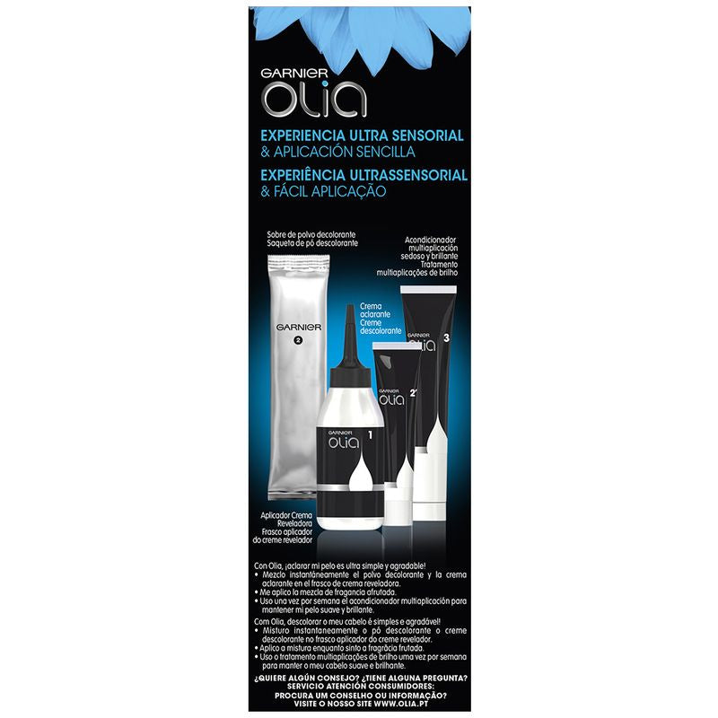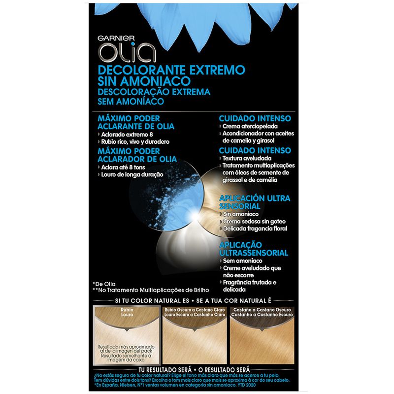 https://www.farmaciasdirect.es/products/garnier-olia-decolorante-permanente-sin-amoniaco-con-aceites-florales-naturales-decolorante-extremo-dGA3600541919457Garnier Olia Decolorante Permanente Sin Amoniaco Con Aceites Florales Naturales - Decolorante Extremo D+++Garnier Olia es un decolorante extremo permanente, sin amoniaco para un olor agradable, con aceites florales de origen natural. Tiene un máximo poder aclarante hasta 8 tonos para un rubio luminoso de larga duración. Aplicación sencilla con crema sedosa sin goteo. Acondicionador con aceites de camelia y girasol, cuidado intenso.Ingredientes1113401 - INGREDIENTS: POTASSIUM PERSULFATE • SODIUM METASILICATE • SODIUM PERSULFATE • CI 77891 / TITANIUM DIOXIDE • SILICA [NANO] / SILICA • KAOLIN • EDTA (F.I.L. C54017/3).Modo de empleoAplique el producto sobre el cabello seco sin lavar. Masajee el producto sobre su cabello y deje actuar 30 minutos para un aclarado medio o máximo 45 minutos para un aclarado intenso. Añada una pequeña cantidad de agua sobre el cabello y masajee de nuevo. Aclare abundantemente el cabello.CaracterísticasAclarado hasta 8 tonos, para un rubio luminoso de larga duraciónhttps://www.farmaciasdirect.es/cdn/shop/files/GA3600541919457_aRnATmnuVw.jpg?crop=center&height=300&v=1725069311&width=300https://www.farmaciasdirect.es/cdn/shop/files/GA3600541919457_aRnATmnuVw.jpg?crop=center&height=100&v=1725069311&width=1007.99.81.919.39