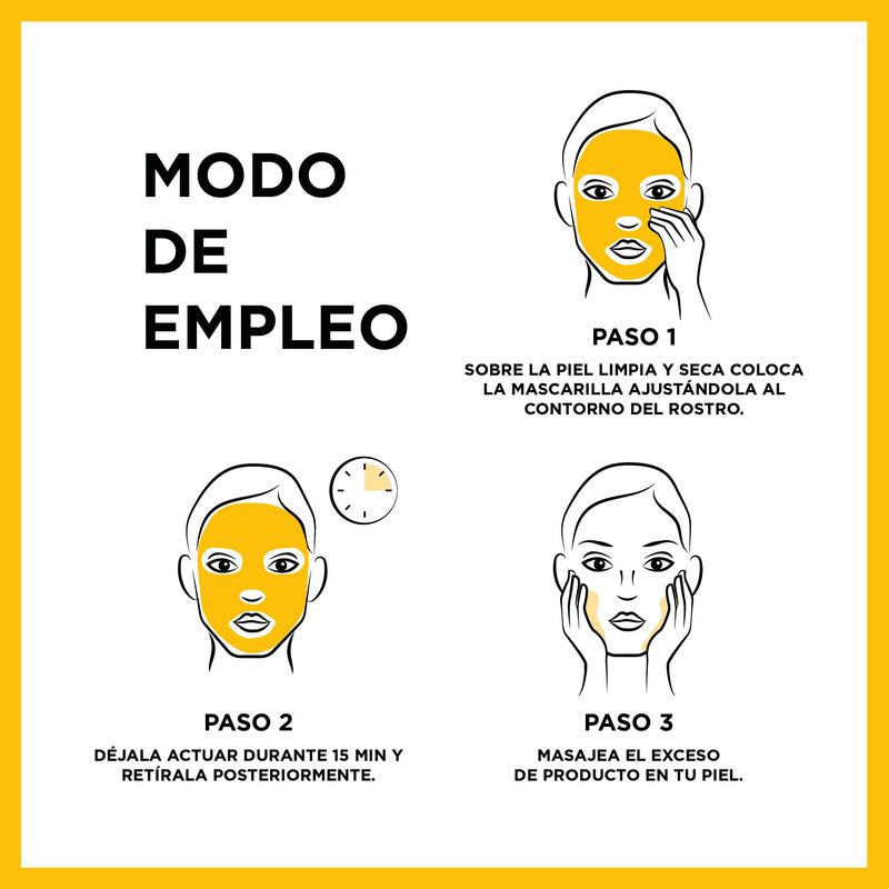 Uso fácil: despliega la mascarilla, aplícala sobre la piel limpia, retira la película protectora y déjala actuar durante 15 minutos. Retira la mascarilla y masajea cuidadosamente el rostro o usa un algodón para absorber el producto sobrante.