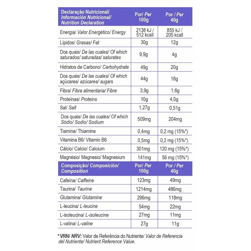 Chocolate con leche en polvo (azúcar, leche entera en polvo, manteca de cacao, pasta de cacao, suero en polvo, emulgente [E322 (soja)], aroma) [44,4%], crema de avellanas y cacao (azúcar, aceite de girasol, suero de leche en polvo, cacao en polvo desgrasado, pasta de avellana (2%), emulgente (E322 (soja)), aroma, antioxidante (E306, E304)), avellana [17,3%], pasta de azúcar (azúcar, jarabe de glucosa (sulfitos), agua, acidulante (E336), proteína de arroz, chocolate negro 60% cacao (pasta de cacao, azúcar, manteca de cacao, emulgente (E322 (soja), E476), aroma) [1,4%], regulador de la acidez (E341), L-taurina [1,2%], sal marina [1%], L-glutamina, óxido de magnesio, cafeína [0,12%], L-leucina, L-valina, L-isoleucina, clorhidrato de tiamina, clorhidrato de piridoxina.