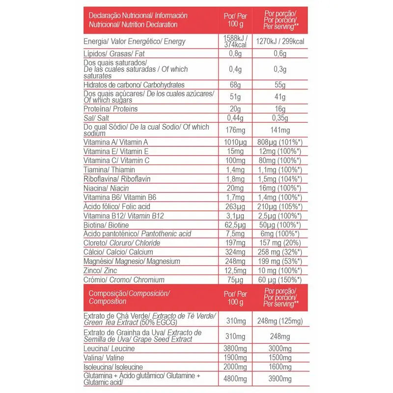 Dextrosa, maltodextrina, fructosa, aislado de proteína de suero (11,7%), emulsionante (lecitina de girasol), concentrado de proteína de suero (9,7%), emulsionante de lecitina de girasol), azúcar, inulina, acidulante (ácido cítrico); citrato de calcio, carbonato de magnesio, L-glutamina, L-leucina, colorante (beta-caroteno), aroma, L-isoleucina, L-valina, extracto de té verde (0,31%), extracto de semilla de uva (0,31%), sal, L -ácido ascórbico, cloruro de cromo, acetato de DL-alfa-tocoferilo, nicotinamida, acetato de retinilo, D-pantotenato de calcio, gluconato de zinc, cianocobalamina, clorhidrato de piridoxina, riboflavina, mononitrato de tiamina, ácido pteroilmonoglutámico, D-biotina
