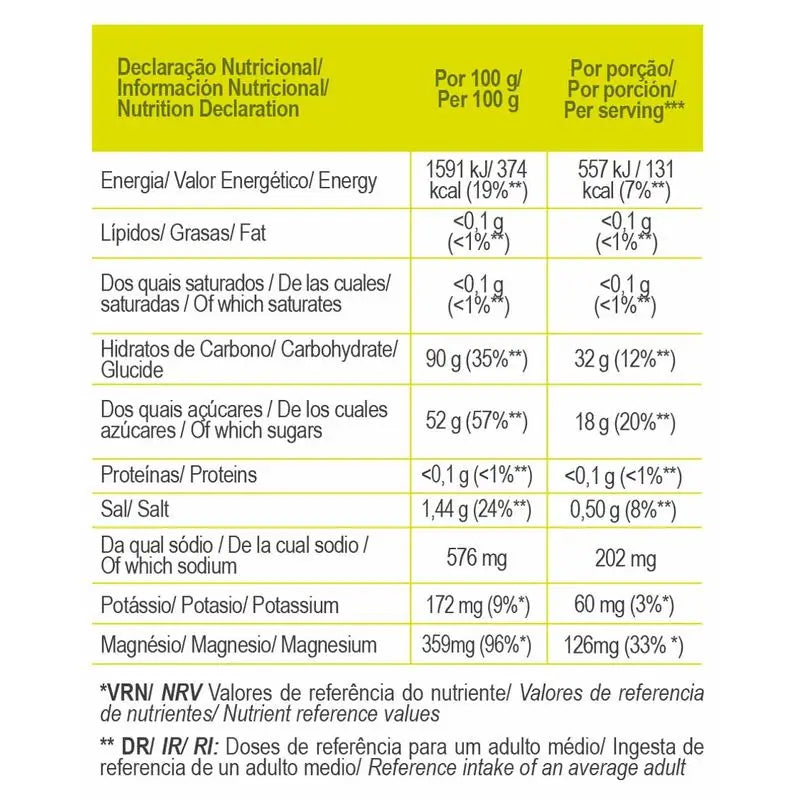 Dextrosa [56%], fructosa [28%], maltodextrina [10%], citrato de magnesio, sal yodada, corrector de acidez (ácido cítrico), aroma, citrato de potasio, colorante (betacaroteno). Apto para vegetarianos y veganos. Fabricado en instalaciones donde se manipula gluten, huevo, soja, lácteos y pescado, por lo que puede contener trazas de los mismos.