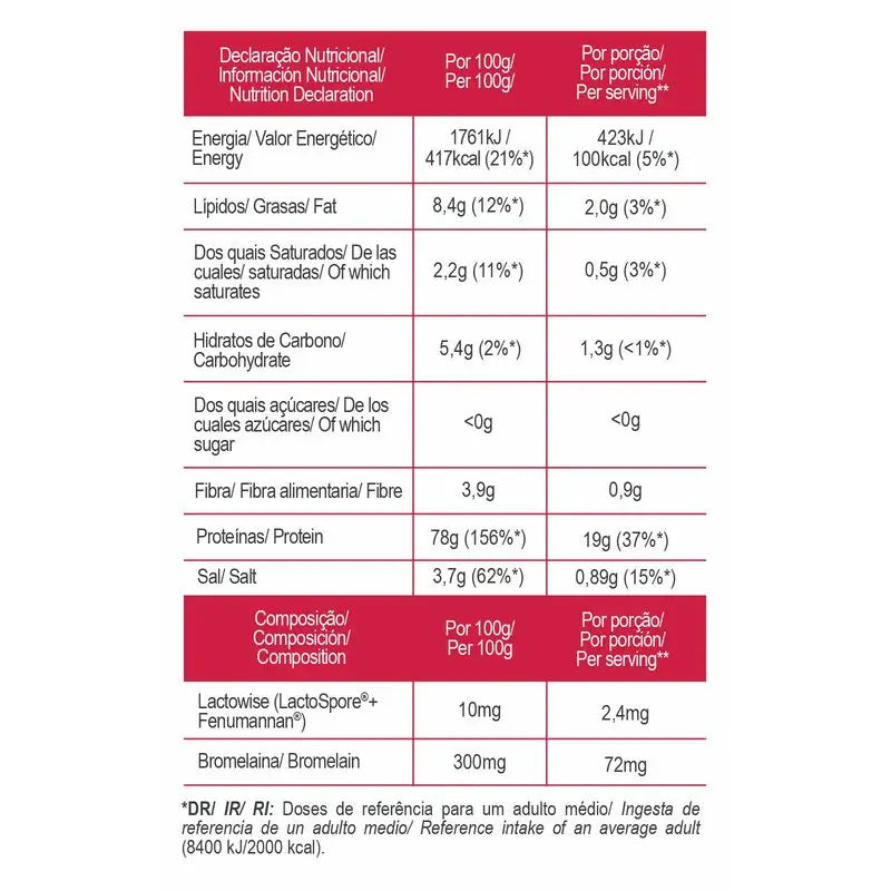 Proteína de guisante (92%), proteína de arroz integral (3%), sabor, color (rojo remolacha), Spectra ™ (Coffea Arabica, concentrado de brotes de brócoli, extracto de té verde, extracto de cebolla, manzana extracto, extracto de acerola, camu camu, quercetina, concentrado de tomate, concentrado de brócoli, concentrado de açaí, concentrado de cúrcuma, concentrado de ajo, concentrado de albahaca, concentrado de orégano, concentrado de canela, concentrado de saúco, concentrado de zanahoria, concentrado de mangostán, concentrado de grosella, extracto de arándano, cereza concentrado, concentrado de mora, concentrado de aronia, concentrado de frambuesa, concentrado de espinaca, concentrado de col, extracto de arándano, concentrado de coles de Bruselas), cloruro de sodio. Apto para vegetarianos y veganos. Fabricado en instalaciones donde se manipulan gluten, huevo, soja, lácteos y pescado, por lo que puede contener trazas de ellos.