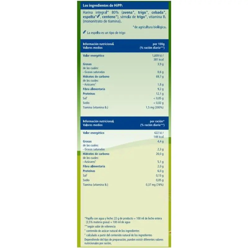 HiPP Biológico Multicereales es una papilla elaborada en su mayoría a partir de cereales integrales de avena, trigo, cebada, espelta y centeno. Ingredientes seleccionados minuciosamente y de cultivos biológicos. Indicado a partir del 6º mes del bebé. Elaborados con cereales integrales de grano completo, no dextrinados que aportan un valor nutricional superior al resto de cereales refinados.