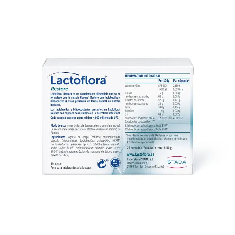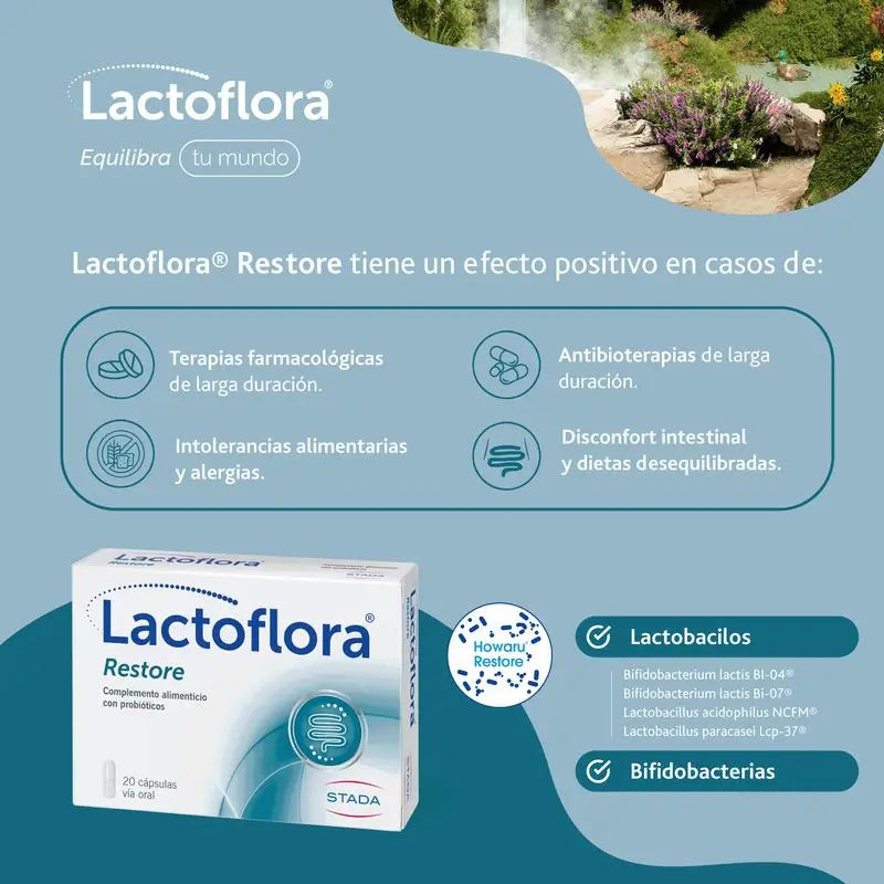 Lactoflora Restor es un complemento alimenticio que favorece la salud digestiva, ayudando a restaurar la flora bacteriana cuando esta ha sido dañada por diferentes causas. Está compuesta por bacterias amigables que tienen la función de optimizar las funciones digestivas, entre las que se encuentra el procesado de los alimentos. Además, entre el 70 y el 80 % de las defensas se forman en el estómago, lo que hace que su disminución ocasione una gran variedad de problemas al cuerpo humano.