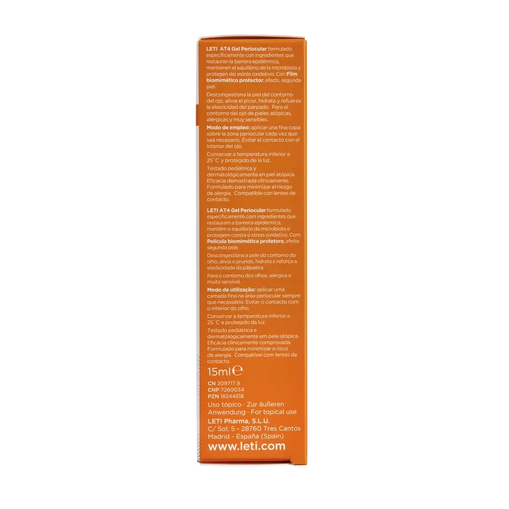 Leti At4 Gel Periocular está indicado para personas con irritación, picazón o sequedad en la zona periocular, así como para aquellos con piel sensible que buscan un cuidado suave y efectivo.