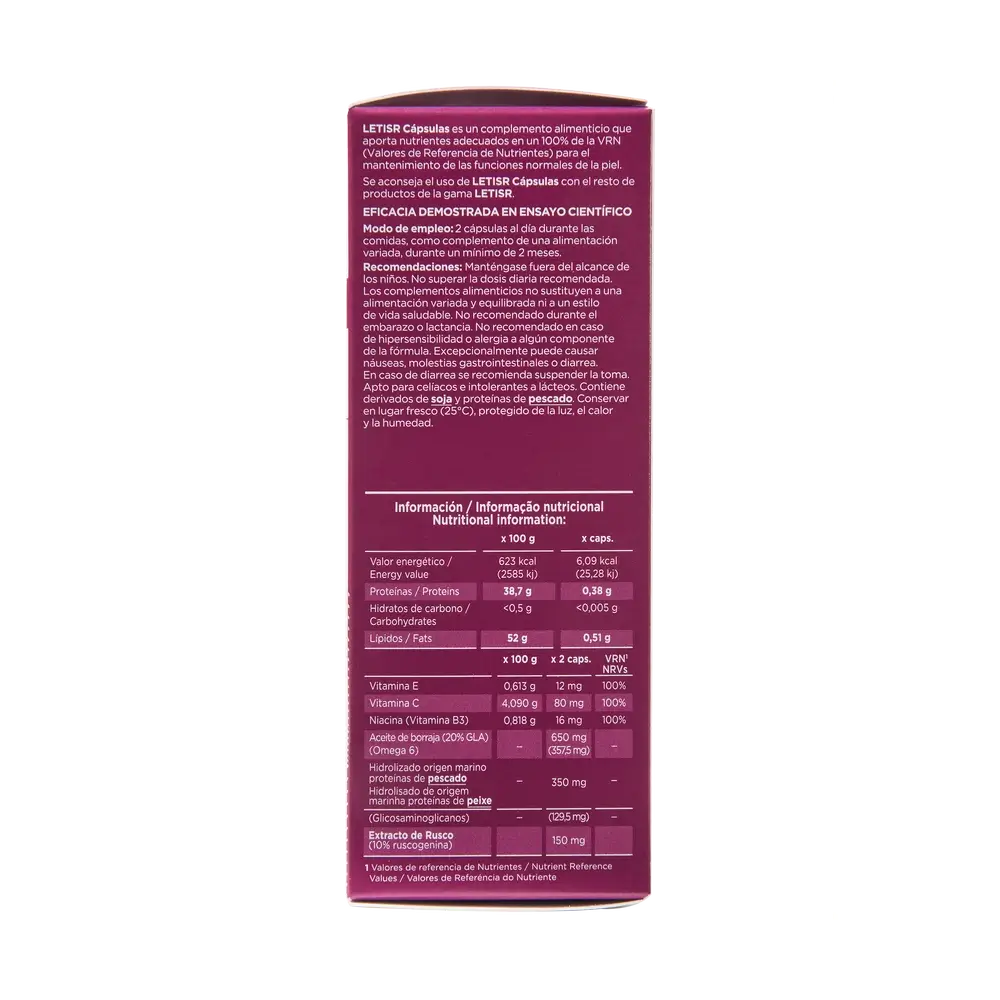 Ingredientes por cápsula: Aceite de Borraja (Borago officinalis L.), gelatina, hidrolizado de origen marino (60% proteínas de colágeno, 5% hidroxiprolina, 37% glicosaminoglicanos), Extracto de Rusco (Ruscus aculeatus L.) (10% ruscogenina), humectante (glicerina), vitamina C (ácido L-ascórbico), aroma, emulgente (lecitina de soja), espesante (monoglicéridos y diglicéridos de ácidos grasos), vitamina E (D-alfa-tocoferol), Niacina (nicotinamida), colorantes (E-555, E-171 y E-172).