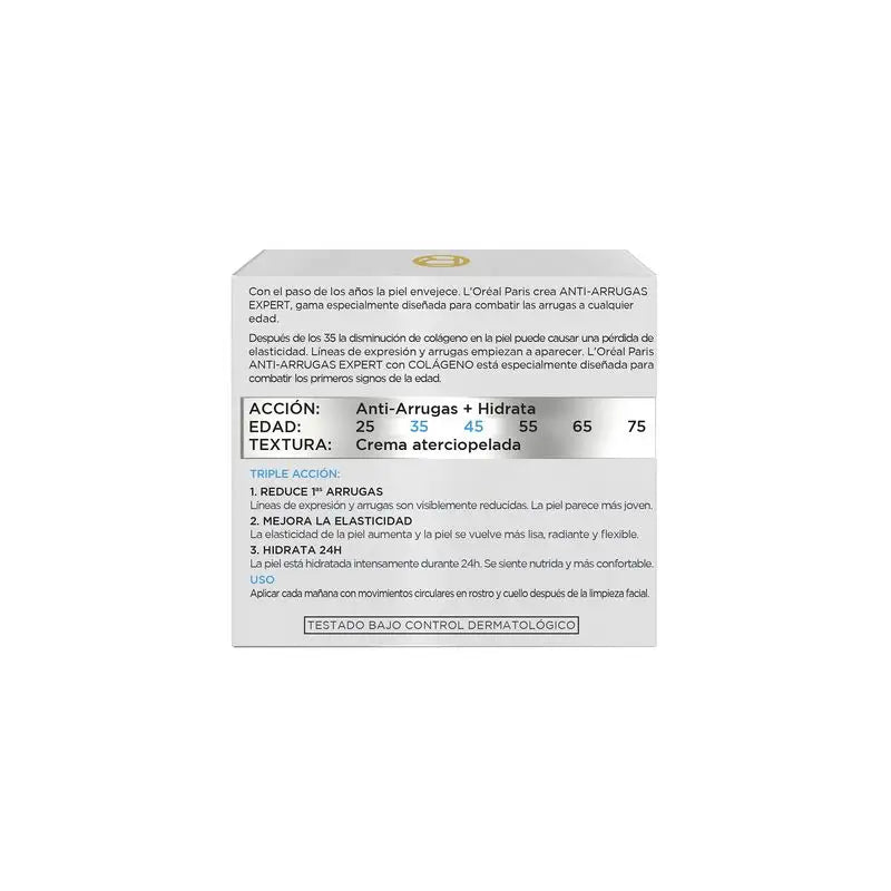 https://www.farmaciasdirect.es/products/loreal-paris-anti-arrugas-expert-crema-de-dia-hidratante-35-anos-50mlLO3600523183845L'Oréal Paris Anti-Arrugas Expert Crema De Día Hidratante +35 Años - 50MlCrema hidratante enriquecida con colágeno, rellena las arrugas. La piel recupera su elasticidad y se mantiene hidratada.Ingredientes909358 02 - INGREDIENTS: AQUA / WATER • GLYCERIN • ISOHEXADECANE • DIMETHICONE • ZEA MAYS STARCH / CORN STARCH • ISOPROPYL ISOSTEARATE • PROPYLENE GLYCOL • OXIDIZED STARCH ACETATE • OCTYLDODECANOL • CETYL ALCOHOL • BEHENYL ALCOHOL • HYDROLYZED SOY PROTEIN • ADENOSINE • ATELOCOLLAGEN • CAPRYLOYL SALICYLIC ACID • PENTAERYTHRITYL TETRAISOSTEARATE • SODIUM CHONDROITIN SULFATE • TRISODIUM ETHYLENEDIAMINE DISUCCINATE • BUTYLENE GLYCOL • CAPRYLYL GLYCOL • CETEARYL ALCOHOL • CETEARYL GLUCOSIDE • MYRISTIC ACID • PALMITIC ACID • PEG-100 STEARATE • PENTYLENE GLYCOL • SILICA DIMETHYL SILYLATE [NANO] / SILICA DIMETHYL SILYLATE • SODIUM POLYACRYLATE • SODIUM POLYACRYLATE STARCH • SODIUM STEAROYL GLUTAMATE • SOLUBLE COLLAGEN • STEARIC ACID • TRISODIUM EDTA • XANTHAN GUM • ALPHA-ISOMETHYL IONONE • BENZYL ALCOHOL • BENZYL SALICYLATE • CITRONELLOL • HEXYL CINNAMAL • LINALOOL • HEXYLENE GLYCOL • PHENOXYETHANOL • POTASSIUM SORBATE • PARFUM / FRAGRANCE (F.I.L. Z70013145/1).Modo de empleoAplicar diariamente, con movimientos circulares en rostro y cuello, después de la limpieza facial.CaracterísticasReduce arrugas, la piel parece más joven. Mejora la elasticidad de la piel, está más lisa y flexible. Hidrata 24h. La piel se siente más confortable.https://www.farmaciasdirect.es/cdn/shop/files/loreal-paris-anti-arrugas-expert-crema-de-dia-hidratante-35-anos-50ml.webp?crop=center&height=300&v=1732620730&width=300https://www.farmaciasdirect.es/cdn/shop/files/loreal-paris-anti-arrugas-expert-crema-de-dia-hidratante-35-anos-50ml.webp?crop=center&height=100&v=1732620730&width=1006.88.82.022.73