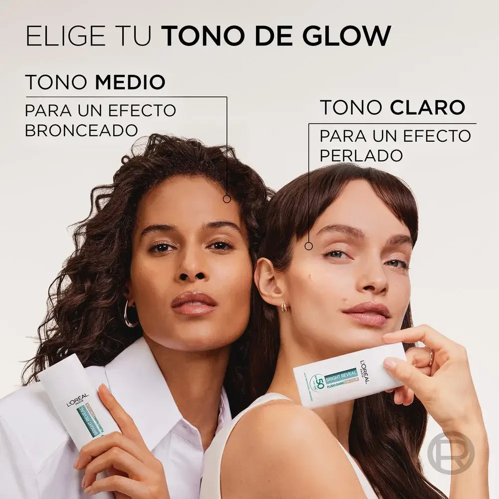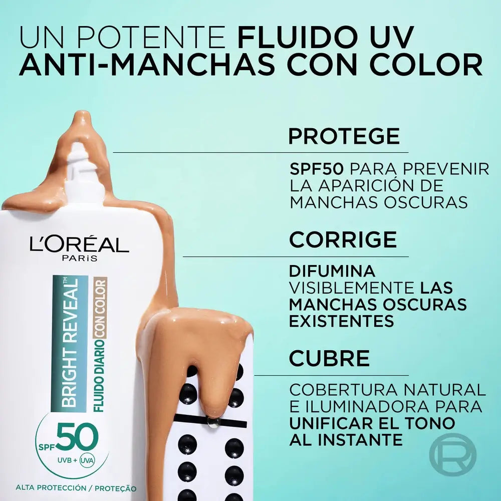 Despierta la luminosidad de tu piel con el Bright Reveal Fluido Diario Con Color con Filtro UV SPF50 y Niacinamida de L'Oréal Paris. Este innovador fluido diario, de alta protección solar, protege, ayuda a prevenir y corrige visiblemente las manchas. Su fórmula avanzada con Niacinamida difumina visiblemente las manchas oscuras, transformando tu piel y dejándola con un aspecto más uniforme y joven.