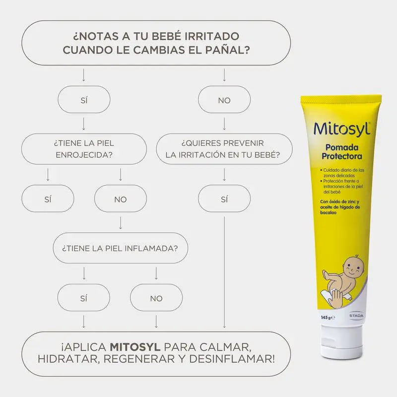 Mitosyl® Pomada Protectora es una crema que protege contra la irritación, el enrojecimiento y escoceduras de la piel del bebé.