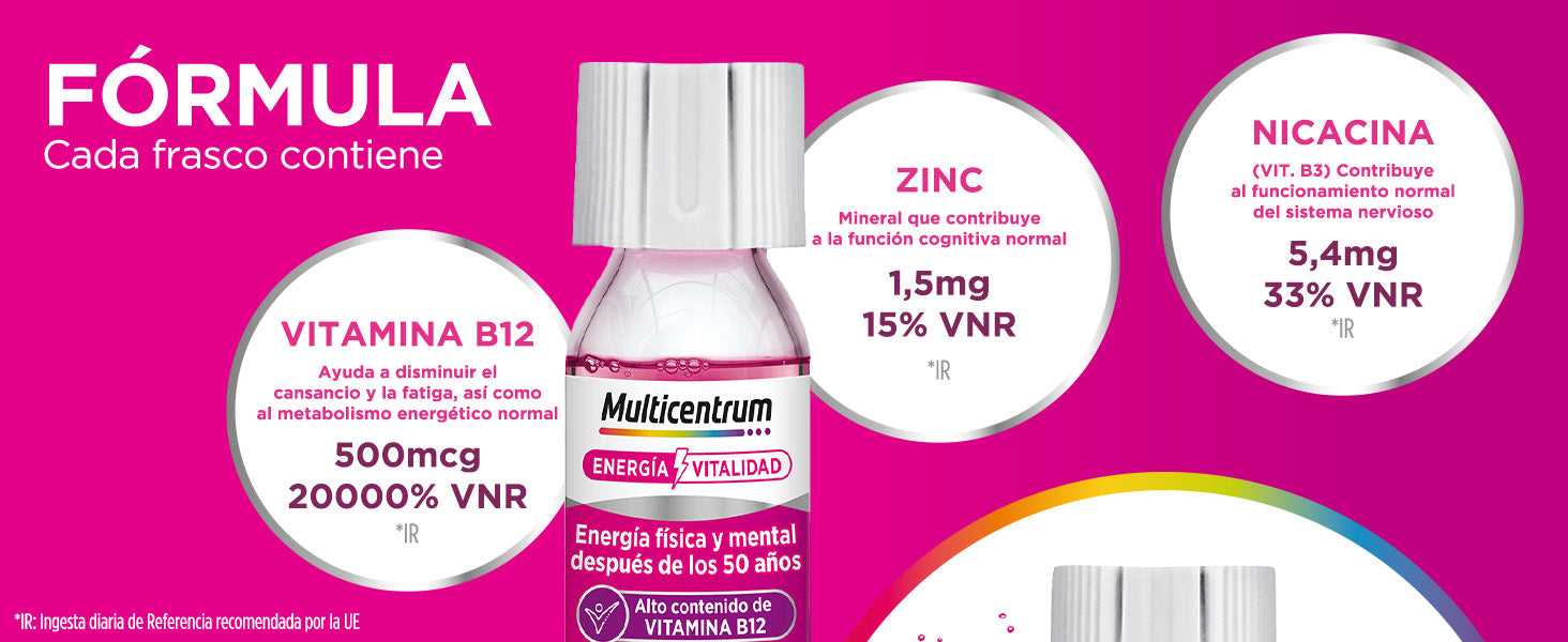 Complemento alimenticio que gracias a su alto contenido en vitamina B12, satisface las necesidades de las personas mayores de 50 años. Multicentrum Energía y Vitalidad 50+ es un complemento alimenticio específicamente formulado para ayudar al organismo en caso de cansancio físico y mental.