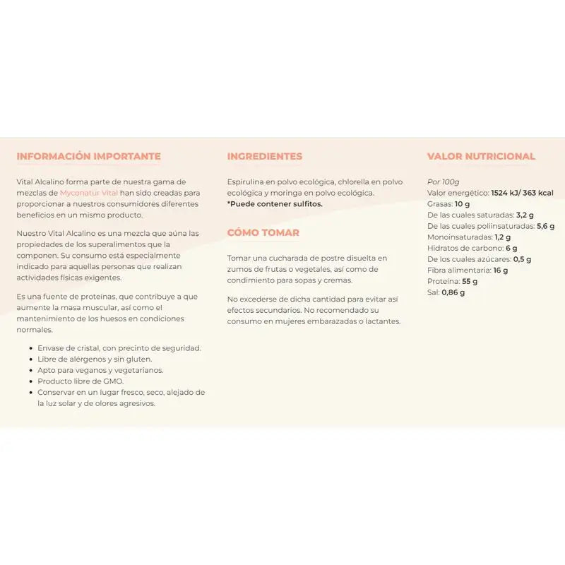 El MYCONATUR VITAL ALCALINO 180gr. ECO puede ser utilizado como complemento en dietas alcalinas, las cuales se basan en consumir alimentos que ayuden a mantener un equilibrio ácido-base en el cuerpo. También puede ser utilizado por personas que buscan mejorar su salud y bienestar de manera natural.