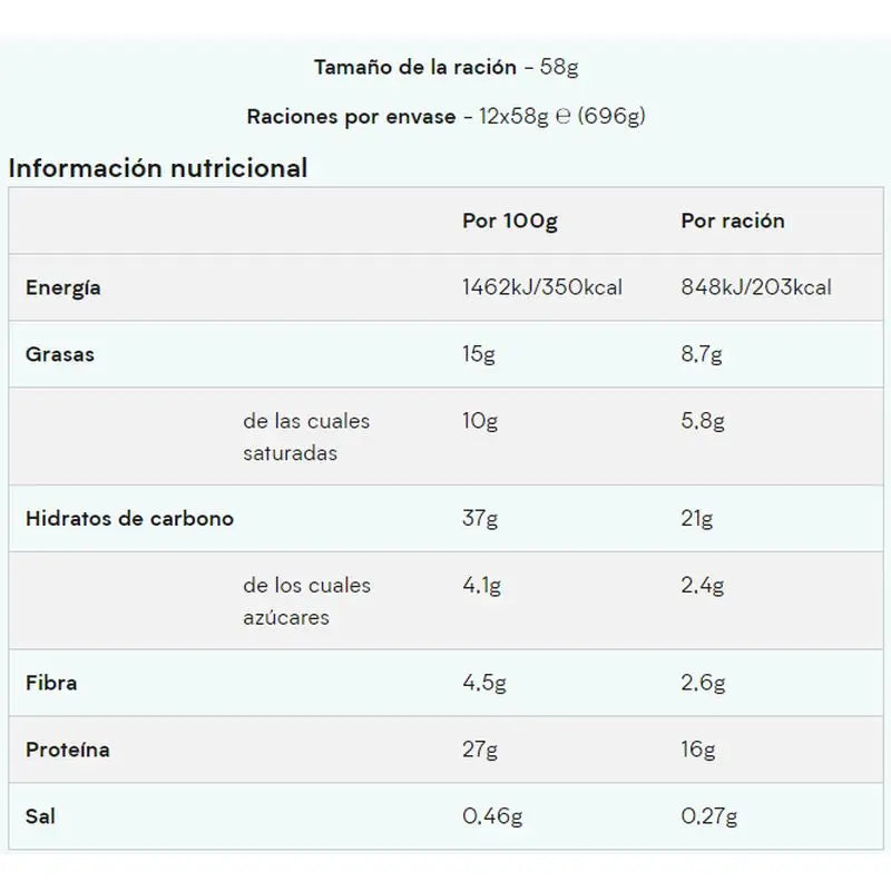 Tamaño de la ración - 58g Raciones por envase - 12x58g ℮ (696g) Información nutricional Por 100g Por ración Energía 1462kJ/350kcal 848kJ/203kcal Grasas 15g 8,7g de las cuales saturadas 10g 5,8g Hidratos de carbono 37g 21g de los cuales azúcares 4,1g 2,4g Fibra 4,5g 2,6g Proteína 27g 16g Sal 0,46g 0,27g