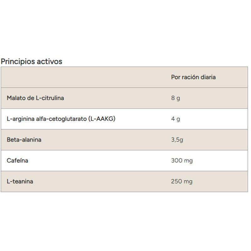 Por ración diaria Malato de L-citrulina 8 g L-arginina alfa-cetoglutarato (L-AAKG) 4 g Beta-alanina 3,5g Cafeína 300 mg L-teanina 250 mg