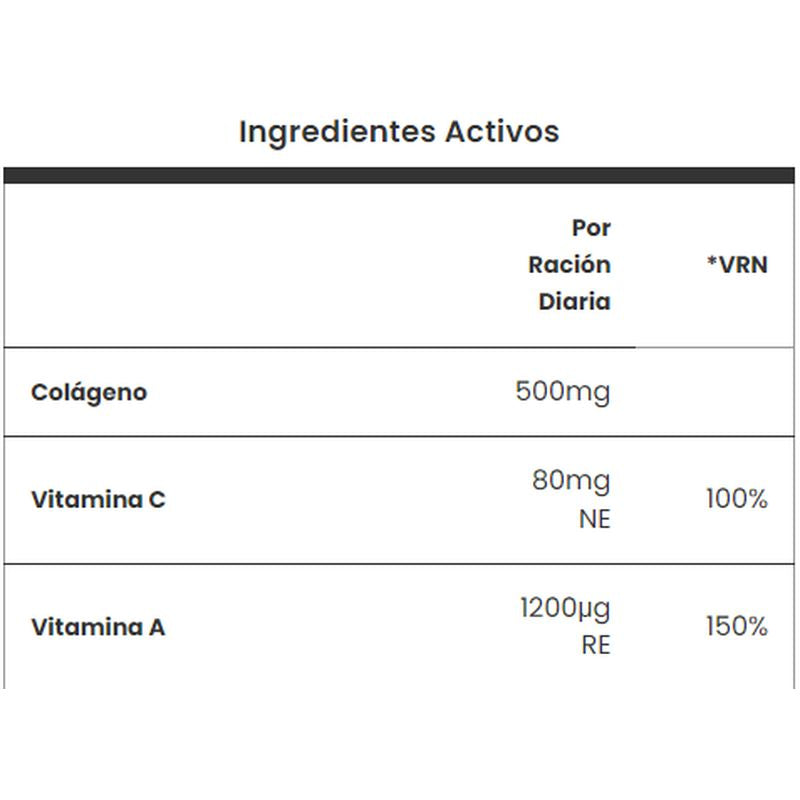 Por ración diaria *VRN Colágeno 500 mg Vitamina C 80 mg NE 100 % Vitamina A 1200 μg RE 150 %