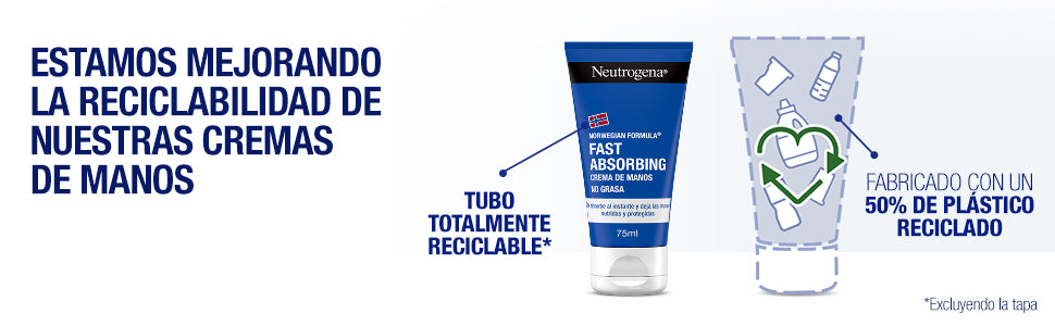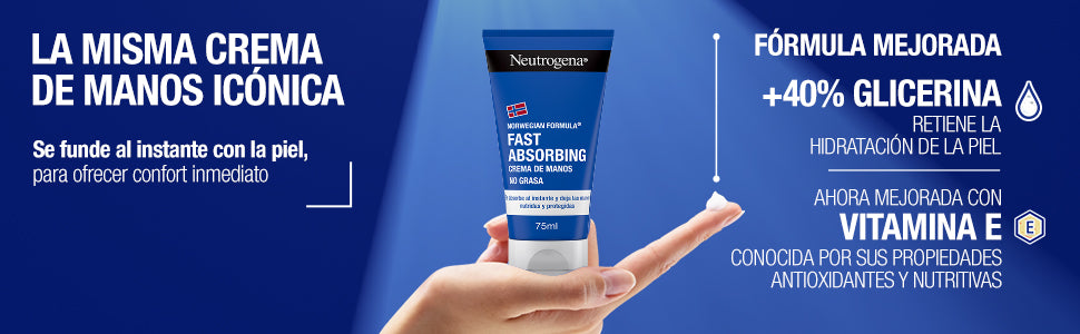 La Crema de Manos Rápida Absorción de Neutrogena es una crema ligera que nutre, protege y repara manos secas y estropeadas proporcionando una absorción inmediata. Entre sus componentes está la Glicerina, que nutre, repara y protege, la Vaselina, que hidrata y suaviza, la Dimeticona, que contribuye a una mayor velocidad de absorción, la Vitamina E, que previene el envejecimiento, el Pantenol, suaviza y calma. Esta crema se absorbe rápidamente, sin dejar sensación grasa.Con más de 80 años de experiencia en el cuidado de la piel, Neutrogena innova continuamente para superar los límites de la belleza. Hoy en día la marca ofrece una amplia gama de productos con resultados visibles gracias a sus soluciones sensibles e inteligentes, desarrolladas con la ayuda de dermatólogos.