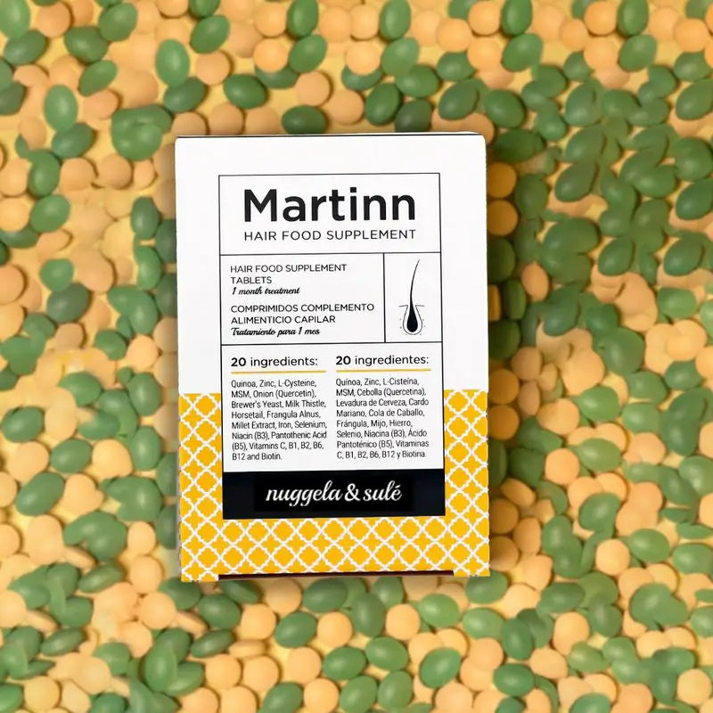 Nuggela Martinn es un complemento alimenticio con dos diferentes tipos de comprimidos para nutrir el cabello. Contiene 30 cápsulas de color naranja encargadas de ejercer acciones en el pelo como nutrir las hebras capilares desde su interior y restaurarlas. Los comprimidos naranja protegen la cabellera, estimulan su crecimiento, su calidad y contrarrestan la caída.